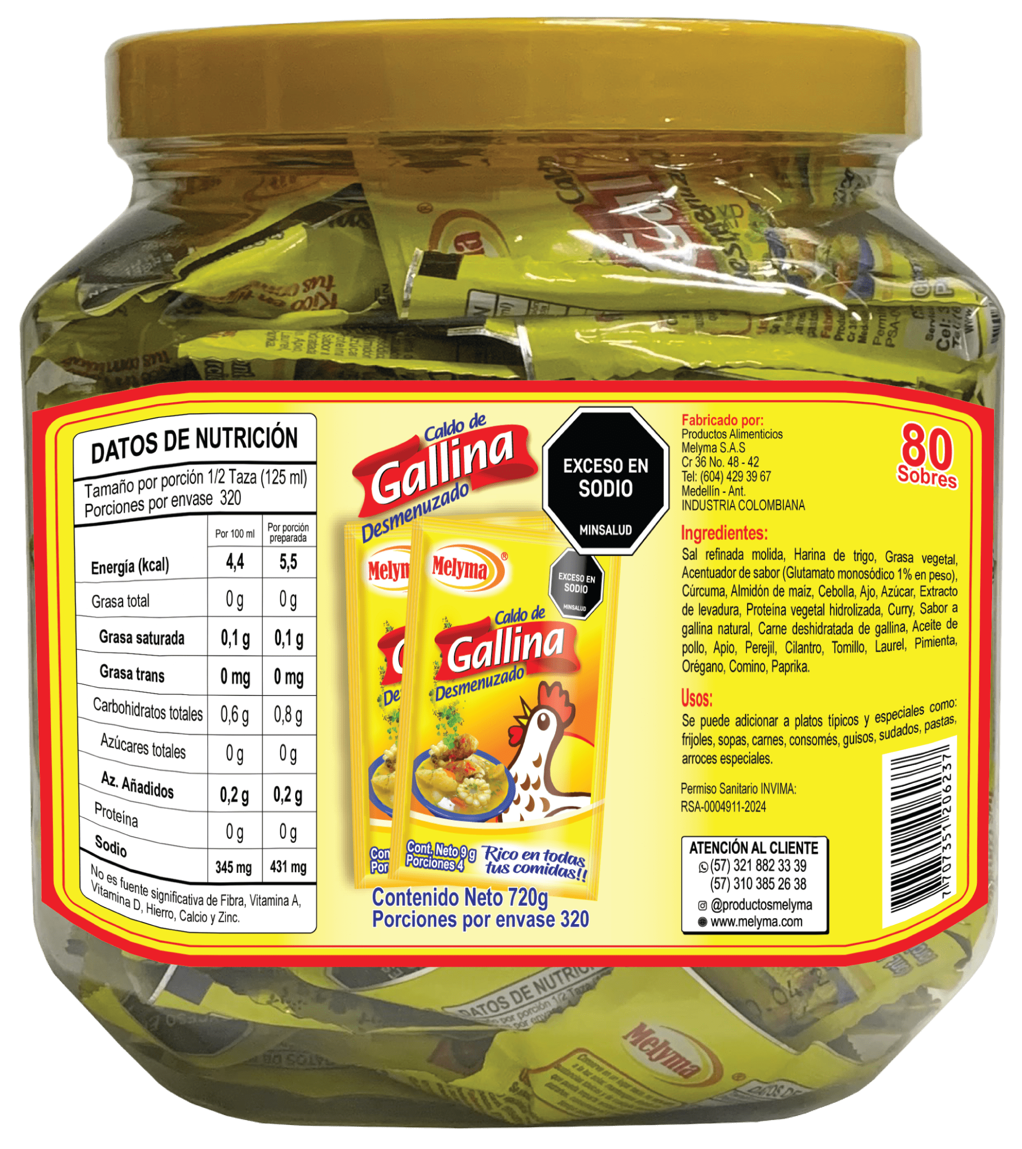 Sal refinada molida, harina de trigo, grasa vegetal (palma), acentuador de sabor (glutamato mono sódico), Colorante Natural (cúrcuma), almidón de maíz, especias y condimentos proteína vegetal hidrolizada, aroma a gallina, carne deshidratada de gallina.